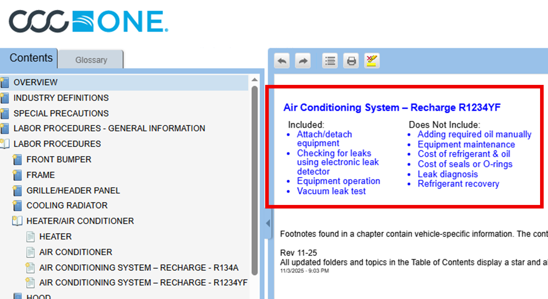 CCC GTE has made updates to its 11-25 REV adding “Air Conditioning System – Recharge R1234YF”.